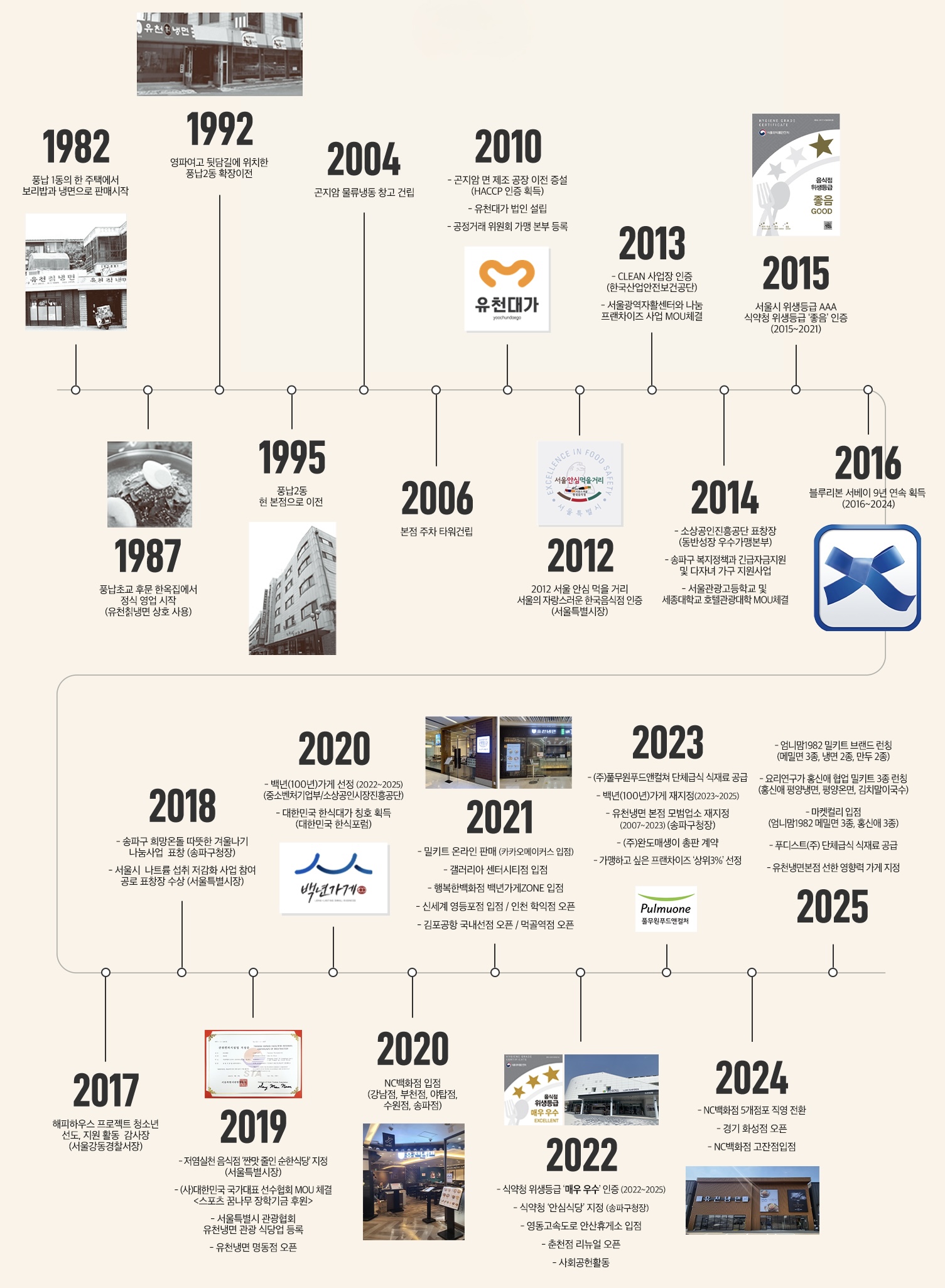 저희 유천냉면은 1982년 서울 송파구 풍납동의 주택가 가정집에서 냉면과 보리밥을 주 메뉴로 선정, 상호 없이 시작했습니다. 이후 1987년 손님들이 불러주시던 <유천냉면>을 정식 상호로 채택해 현재까지 유지하고 있습니다. 다소 밋밋한 느낌의 기존 냉면과는 달리 쫄깃한 칡 면발, 새콤달콤매콤한 양념장과 최초 개발한 살얼음 동동 떠 있는 육수 맛으로 유명하며, 현재 창업주의 아들 최도현 대표이사가 ㈜유천대가와 대표 브랜드 <유천냉면, 엄니맘1982 밀키트 브랜드>를 이끌고 있습니다. 지금껏 유지.성장.발전할 수 있도록 도와주신 고객님들께 다시 한번 진심으로 감사 드리며 음식은 질 좋고 신선한 재료로 정성을 다해야 맛이 결정된다는 저의 경영철학을 이제는 저의 2세와 함께 지켜나갈 것을 약속드립니다.